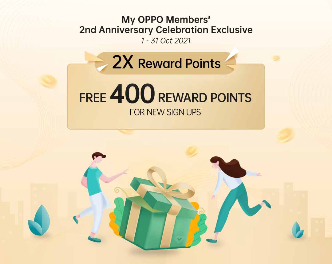 Dalam pada masa yang sama, OPPO juga meraikan pengguna-pengguna baharu aplikasi My OPPO. Pendaftaran baharu aplikasi ini akan terus menerima mata ganjaran sebanyak 400 mata. Untuk ahli sedia ada pula turut ditawarkan mata ganjaran sebanyak 600 mata apabila memperkenalkan aplikasi ini dengan ahli baharu.