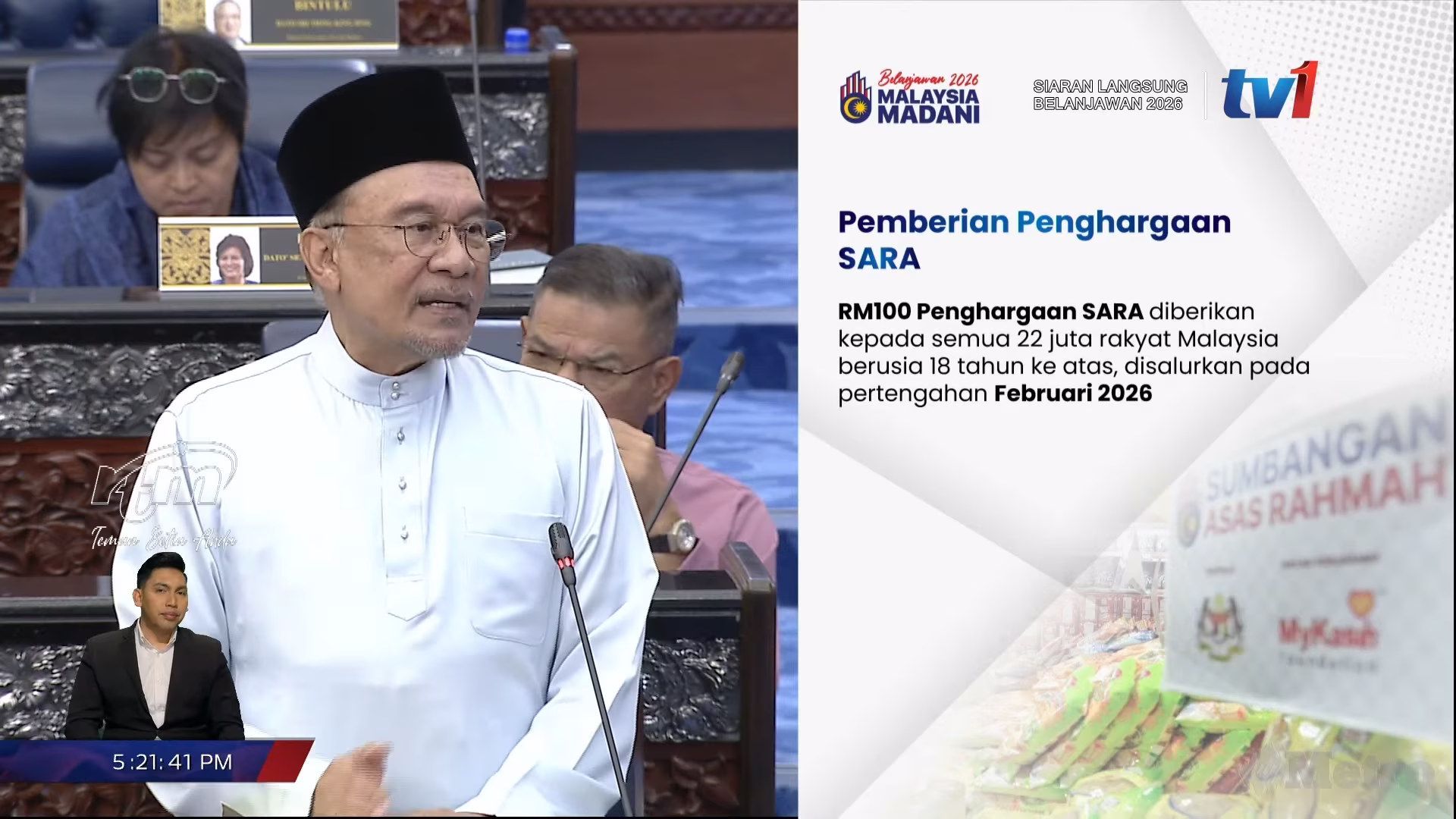 Kerajaan akan mengagihkan bantuan tunai sebanyak RM100 di bawah Program SARA (Sumbangan Asas Rakyat) bermula pertengahan Februari tahun depan. Pemberian kepada warganegara Malaysia yang layak ini diumumkan Perdana Menteri Datuk Seri Anwar Ibrahim ketika membentangkan Belanjawan 2026.