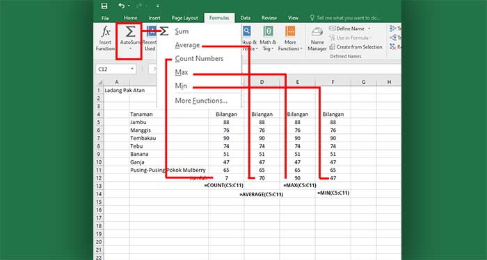 =MIN(C5:C11) Kirakan nilai MIN di dalam senarai.
