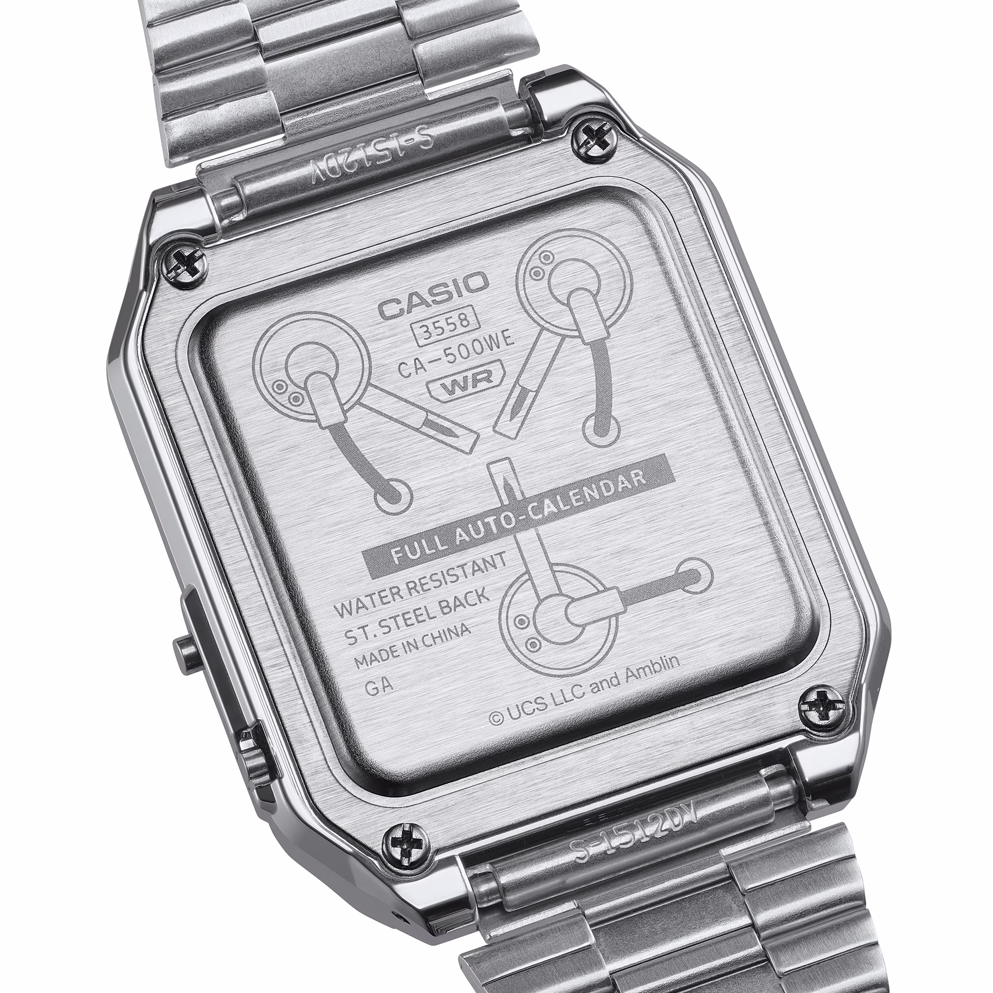 Jam tangan edisi terhad ini mengekalkan bentuk dan ciri-ciri asal model CA-500, tetapi diperkaya dengan elemen rekaan yang diinspirasikan daripada dunia Back to the Future.