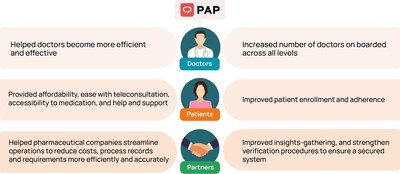 Docquity PAP membantu syarikat-syarikat rakan kongsi farmaseutikal menyelaraskan operasi untuk mengurangkan kos, memproses rekod dan keperluan dengan lebih cekap dan tepat, meningkatkan pengumpulan pandangan dan memantapkan prosedur penentusahan dengan pelbagai semakan dan pengesahan kata kunci sekali (OTP). Ia dapat menjamin sistem yang selamat dan mengurangkan kemungkinan berlakunya kesilapan dan penipuan yang disebabkan oleh proses berasaskan kertas sepenuhnya, pergantungan kepada satu kedai yang mengawal penuh pelaksanaan program, kekurangan tangkapan data bagi bilangan ubat yang dipreskripsi dan didispens serta kurangnya pelaporan kejadian buruk.