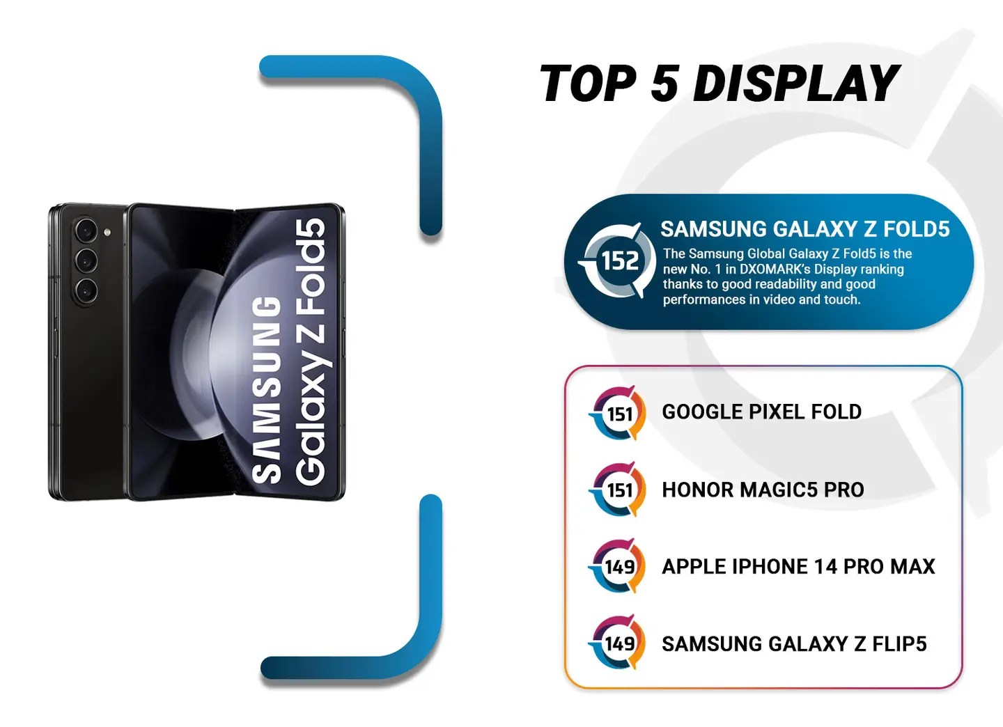 Samsung Galaxy Z Fold 5 dikatakan mempunyai skrin terbaik di kalangan telefon pintar di pasaran pada ketika ini, menurut pendapat pakar di DxOMark. Markah yang dicatatkannya melepasi Google Pixel Fold dengan 1 mata dan Galaxy Z Flip 5 dengan 3 mata