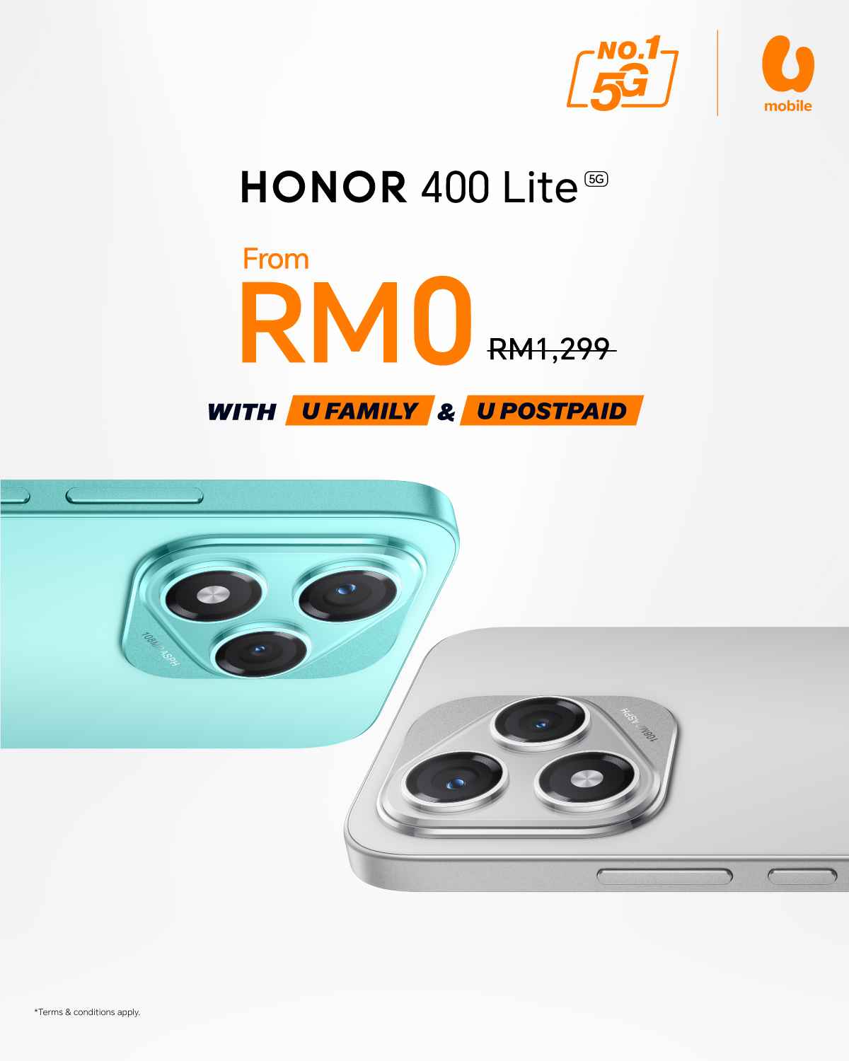 HONOR 400 Lite juga tersedia secara PERCUMA dengan pelan U Postpaid 98 dan U Family 128. Untuk maklumat lanjut mengenai tawaran ini, kunjungi laman sesawang U Mobile di www.u.com.my