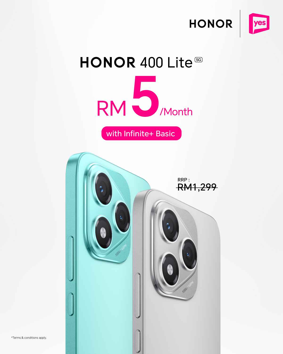 Dengan pelan Yes 5G Infinite+ Basic Plan, pelanggan boleh membawa pulang HONOR 400 Lite pada hanya RM5 dengan pelan langganan RM58 sebulan. Pelanggan boleh mengunjungi mana-mana kedai Yes mulai 2 Mei 2025 untuk menikmati pelan ini. Untuk maklumat lanjut mengenai pelan ini, kunjungi laman sesawang Yes di www.yes.my