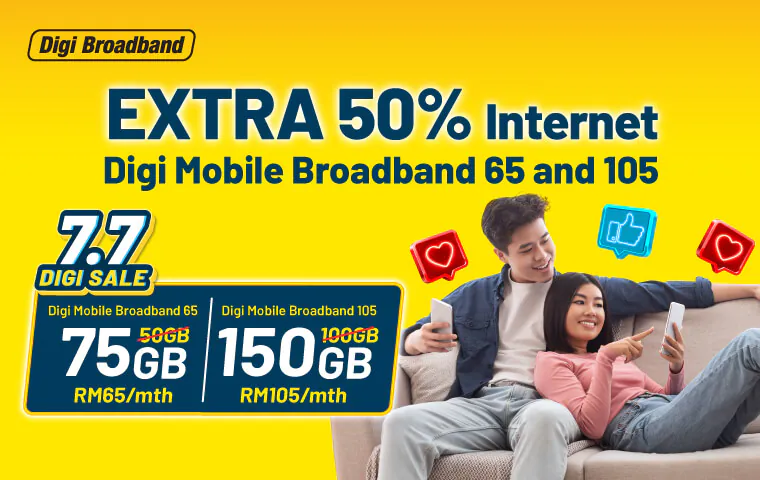 Sebagai bonus untuk pelan data mudah alih, Digi menawarkan data 50% lebih untuk dua pelan Broadband 65 dan 105 menerusi jualan data 7.7 ini. Pelan ini biasanya didatangkan dengan data mudah alih sebanyak 50GB dan 100GB sebulan. Kini melalui tempoh promosi ini, pengguna yang berdaftar dalam tempoh tersebut akan diberikan data masing-masing 75GB dan 150GB.