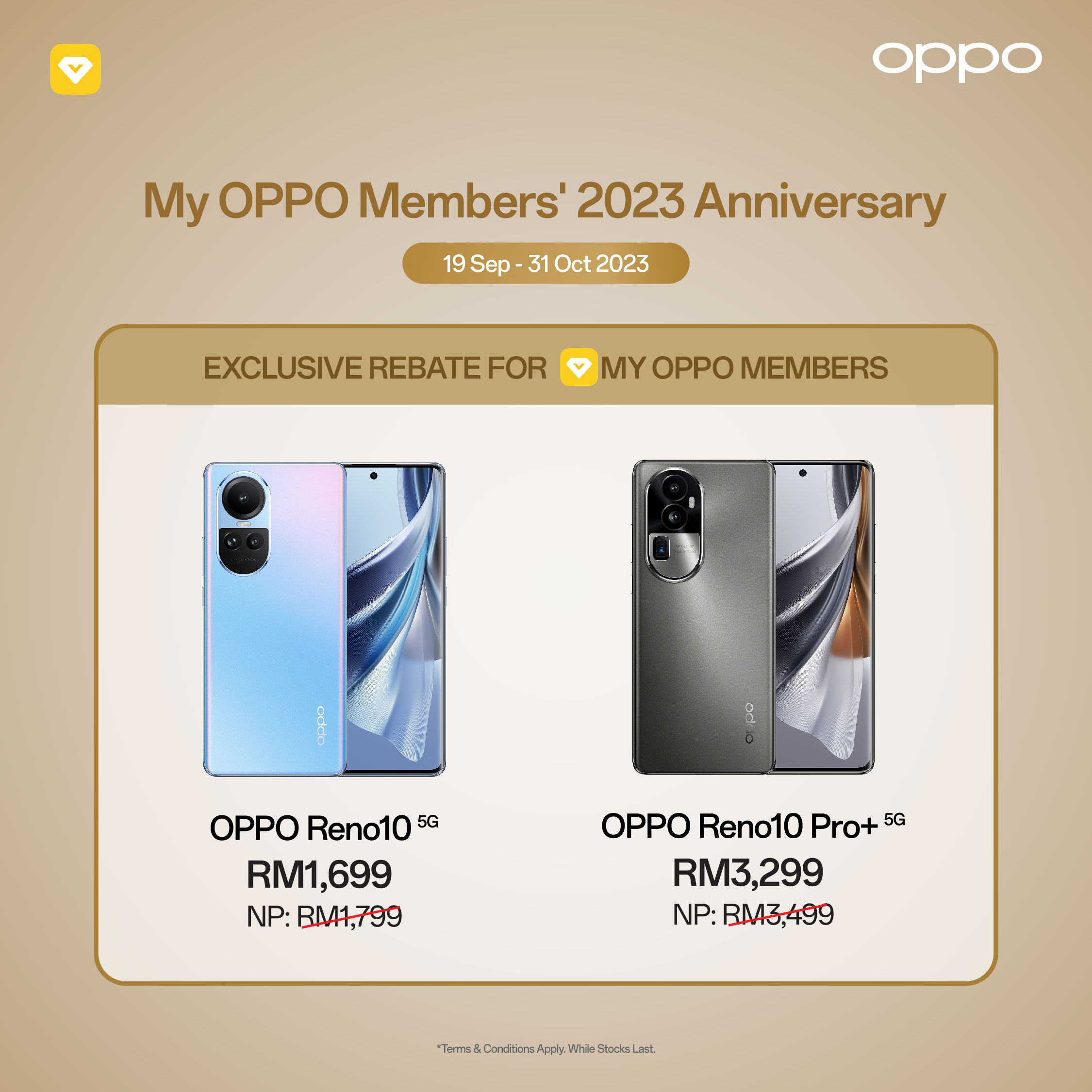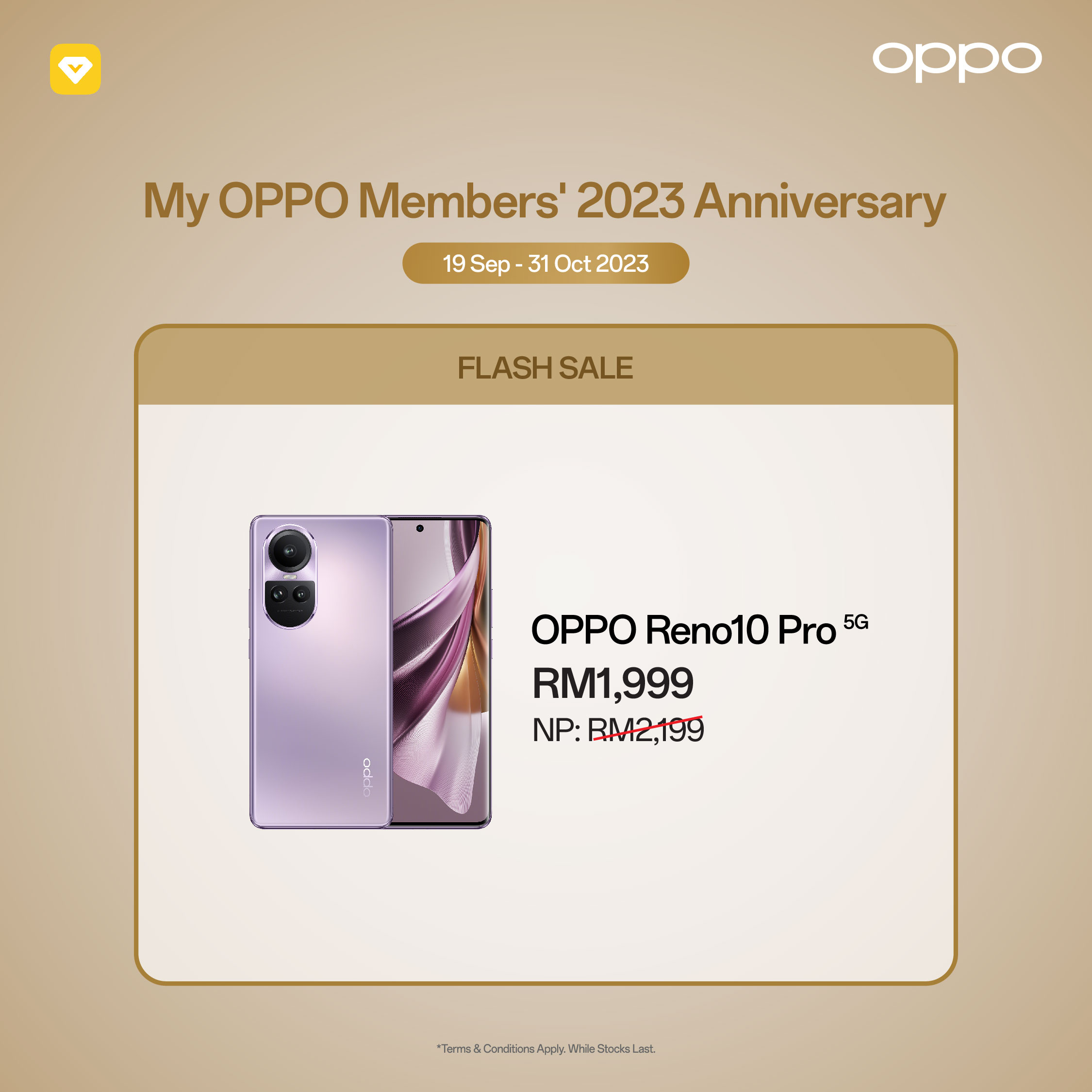 Untuk menambahkan lagi keseronokan pada Ulang Tahun Ahli My OPPO 2023, OPPO memberi ganjaran kepada pelanggan dengan jualan kilat istimewa yang menawarkan potongan RM200 untuk pembelian OPPO Reno10 Pro 5G. Kini, pelanggan boleh memperoleh telefon ini pada harga RM1,999 sahaja, turun daripada harga asalnya iaitu RM2,199.