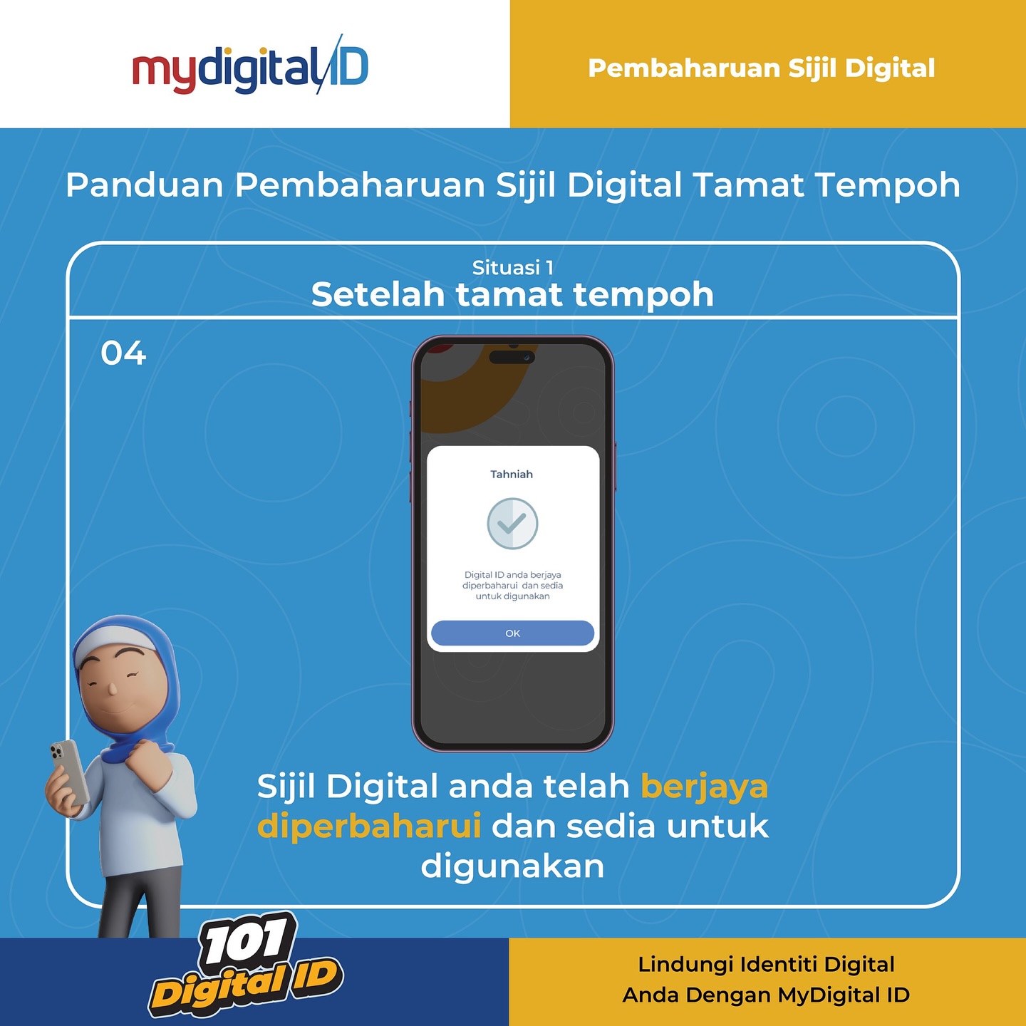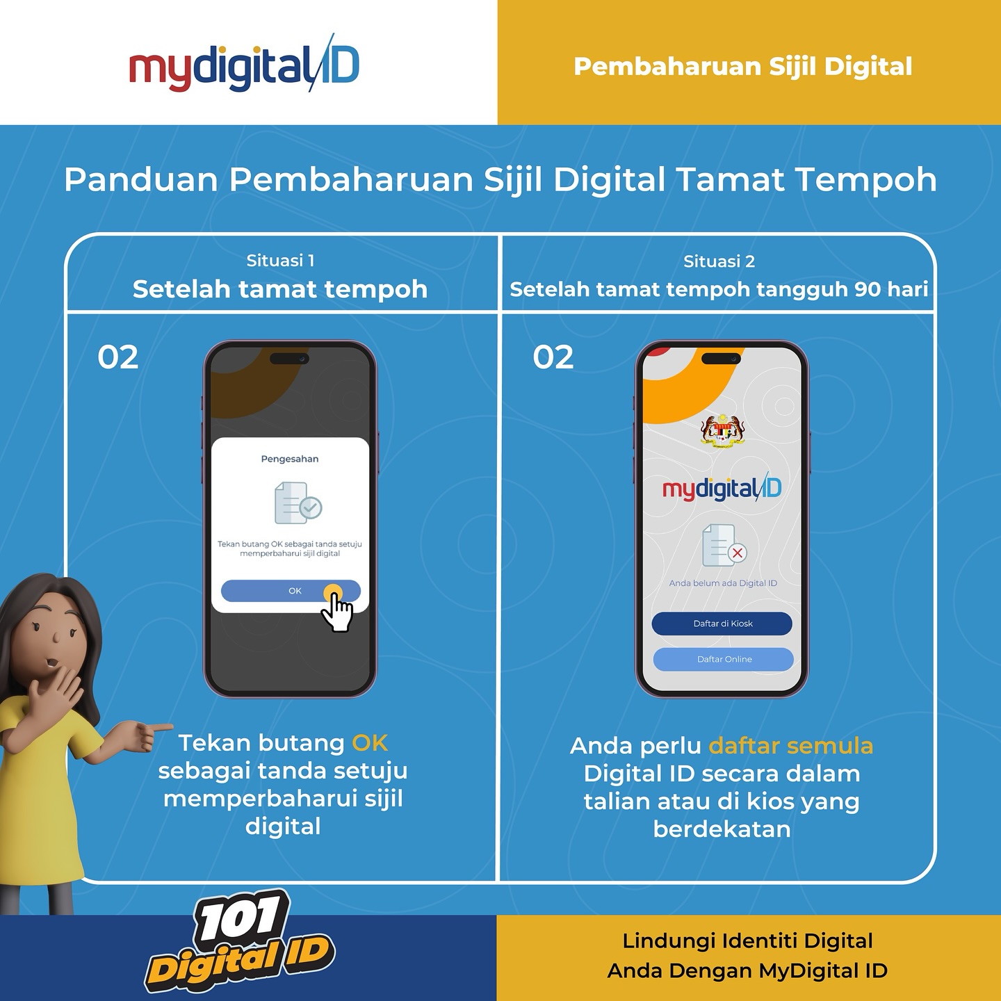 Selepas tamat tempoh, pengguna perlu memperbaharui ID digital berkenaan dalam tempoh 90 hari. Pendaftaran semula MyDigital ID boleh dilakukan secara dalam talian atau di kiosk-kiosk berhampiran jika pembaharuan tidak dilakukan dalam tempoh tersebut.