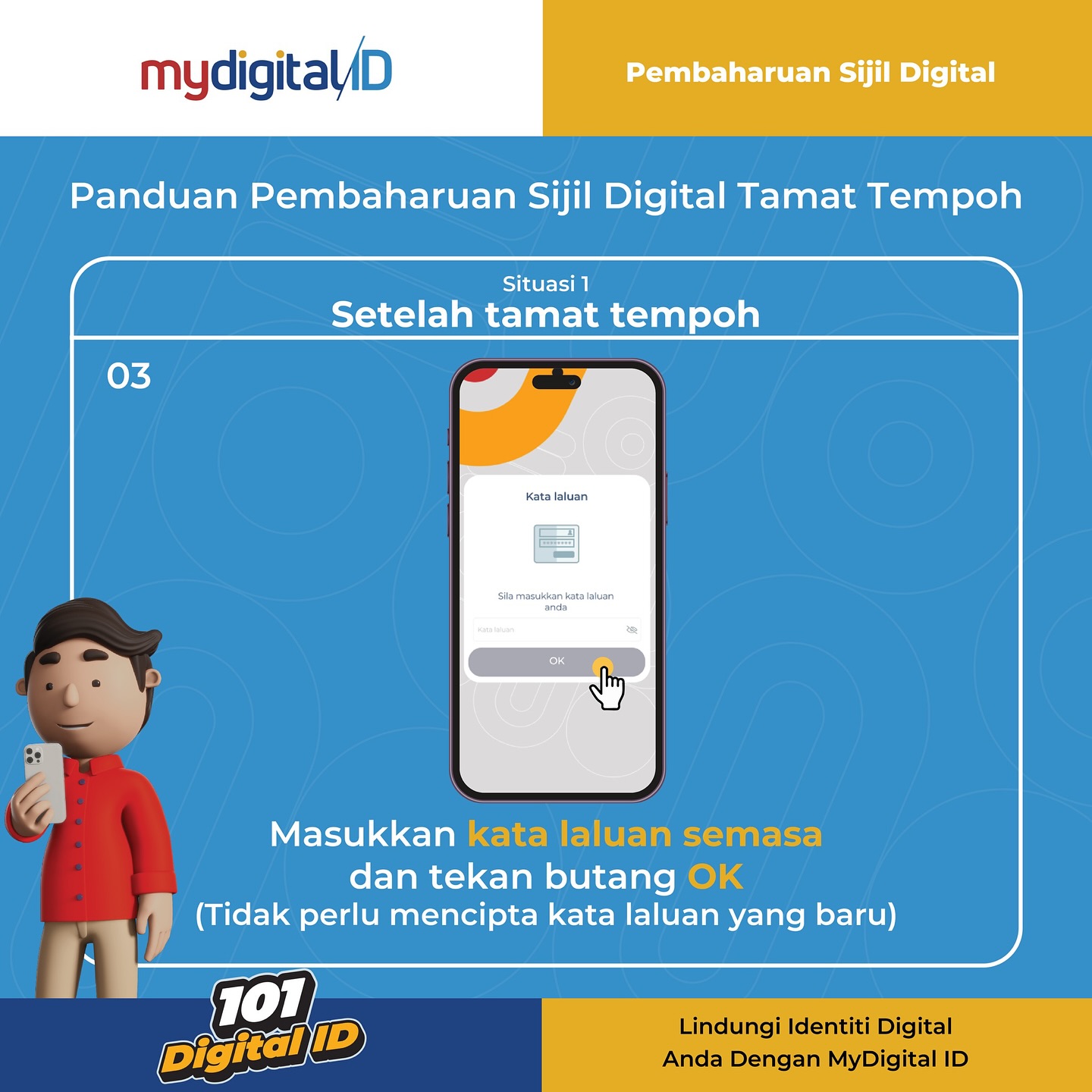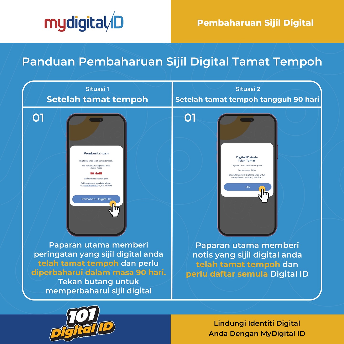 Bagaimanapun, masih terdapat sesetengah pengguna yang tidak mengetahui sijil digital ini mempunyai tarikh luput dan perlu diperbaharui setiap tahun. Sijil Digital MyDigital ID sah digunakan untuk tempoh selama setahun dari tarikh pendaftarannya.