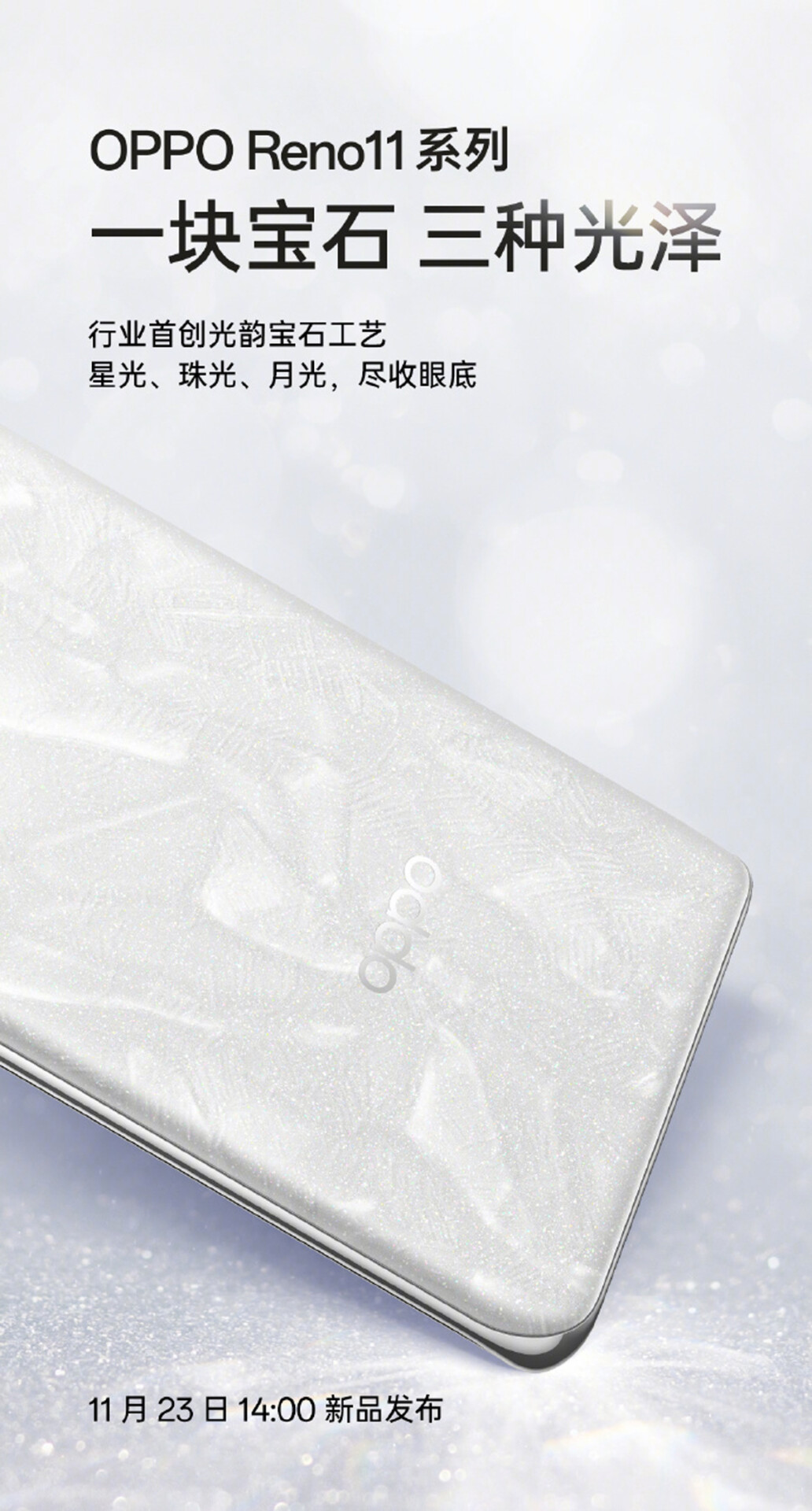Seperti yang dijangkakan, OPPO masih lagi belum mendedahkan maklumat sepenuhnya berkenaan siri telefon pintar baharu tersebut dan hanya berkongsikan sedikit mengenai rekaannya. Reno11 berkenaan telah disahkan akan dilancarkan dengan empat pilihan warna iaitu Moonstone, Flourite Blue, Turquoise, dan Obsidian Black.
