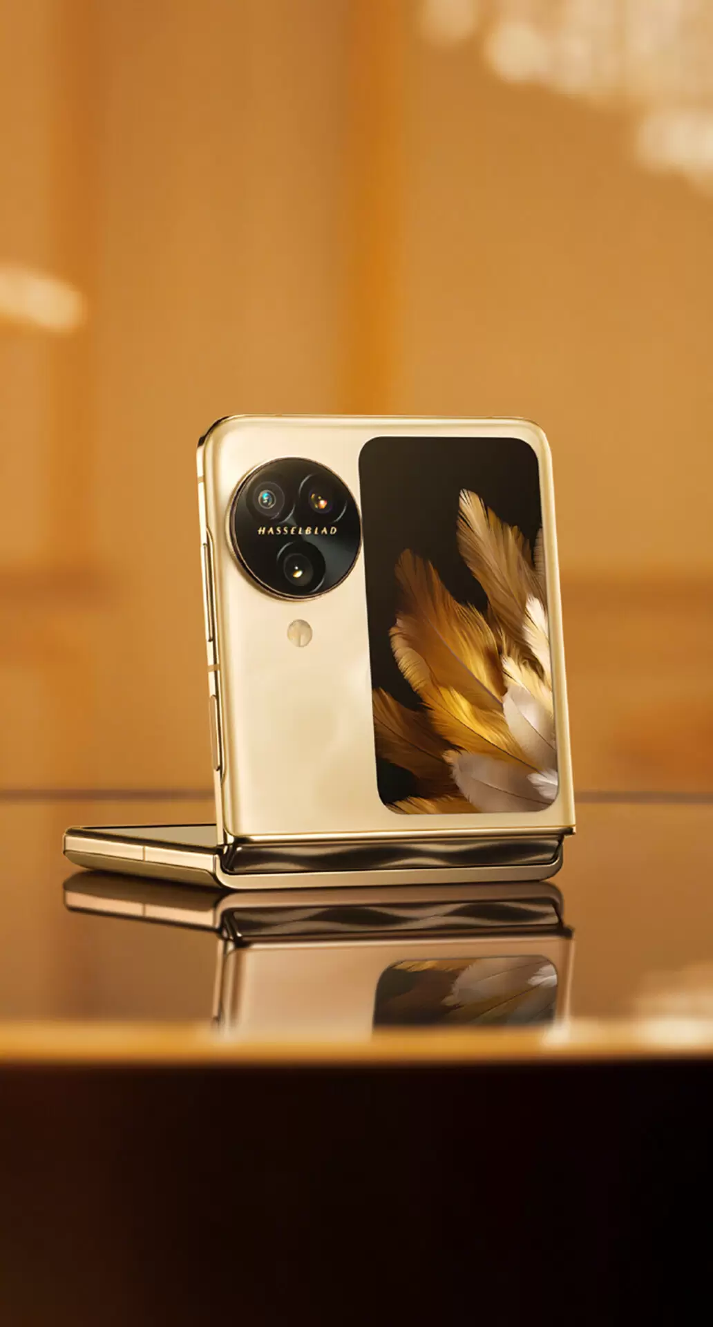 Lain-lain ciri visual yang jelas kelihatan termasuklah logo Hasselblad pada kamera luarannya bersama-sama warna keemasan telefon pintar boleh lipat terkini dari OPPO ini.
