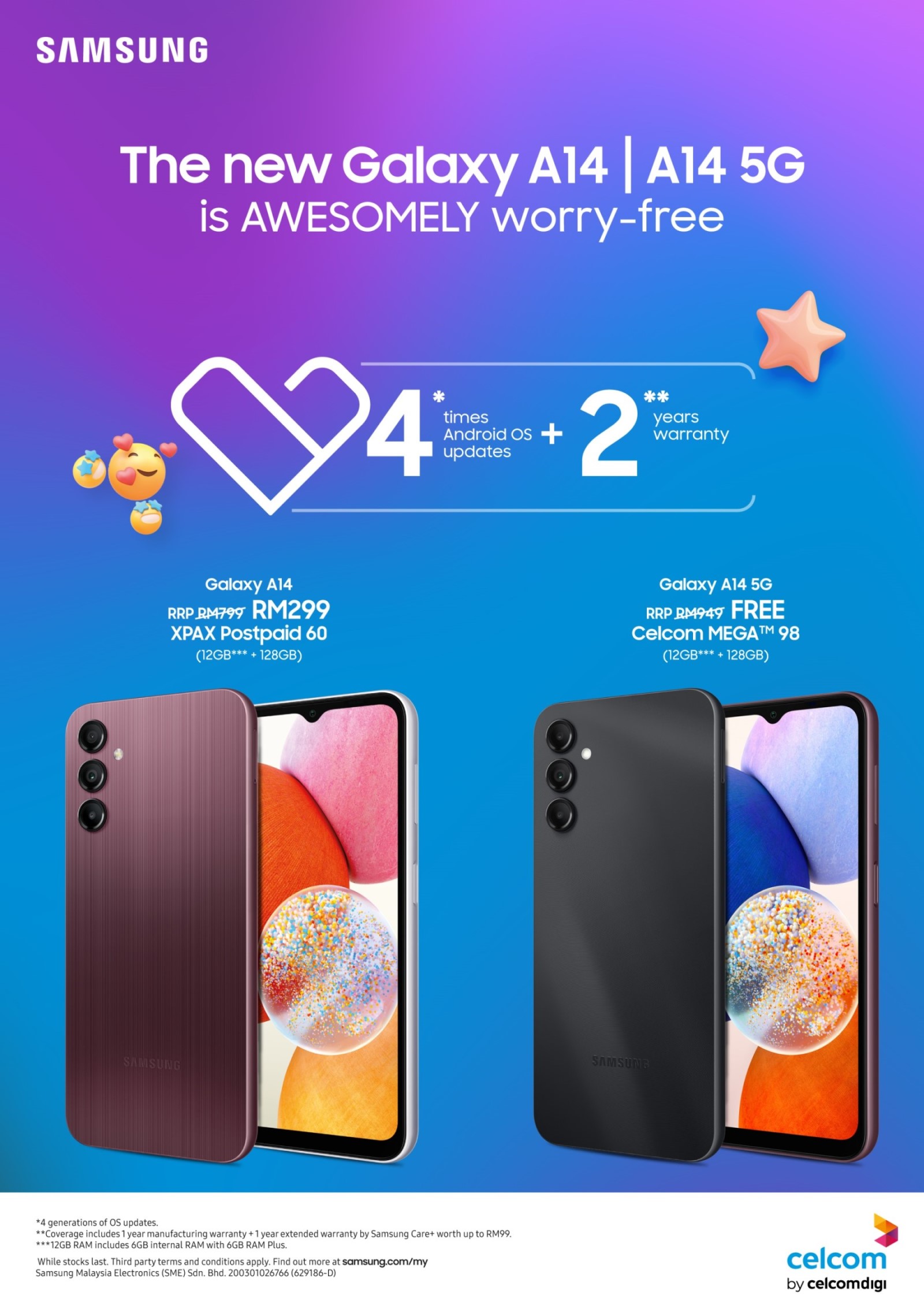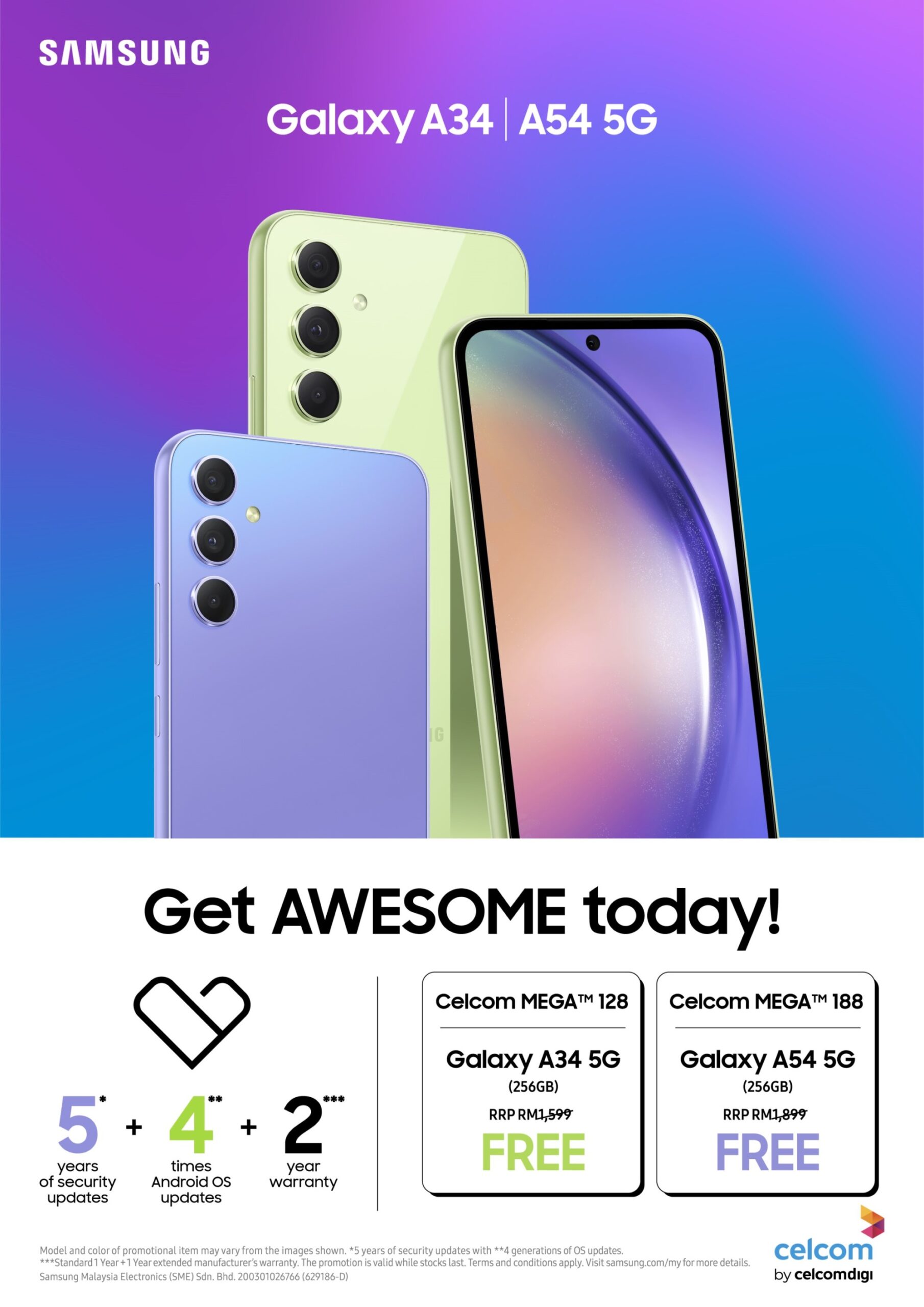 Mencari telefon pintar yang membolehkan anda melakukan Awe-Day, Awe-Night tanpa membebankan wang? Dapatkan Galaxy A14 5G, Galaxy A34 5G dan Galaxy A54 5G terkini dengan penjimatan hebat sekarang dalam rancangan Celcom dan Digi! Anda juga boleh menikmati sehingga 5 tahun kemas kini keselamatan, 4 kali kemas kini OS Android dan 2 tahun jaminan daripada Samsung.
