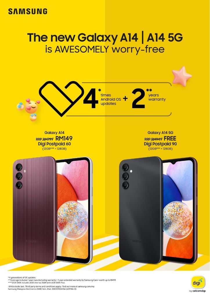 Dengan PhoneFreedom 365 Digi, anda boleh mendapatkan Galaxy A14 5G secara percuma atau Galaxy A34 5G pada harga RM199 pada pelan Digi Postpaid 90, atau Galaxy A54 5G pada harga RM21/bulan pada pelan Digi Postpaid 150. Nikmati penjimatan hebat sehingga RM1,400 daripada harga runcit yang disyorkan!