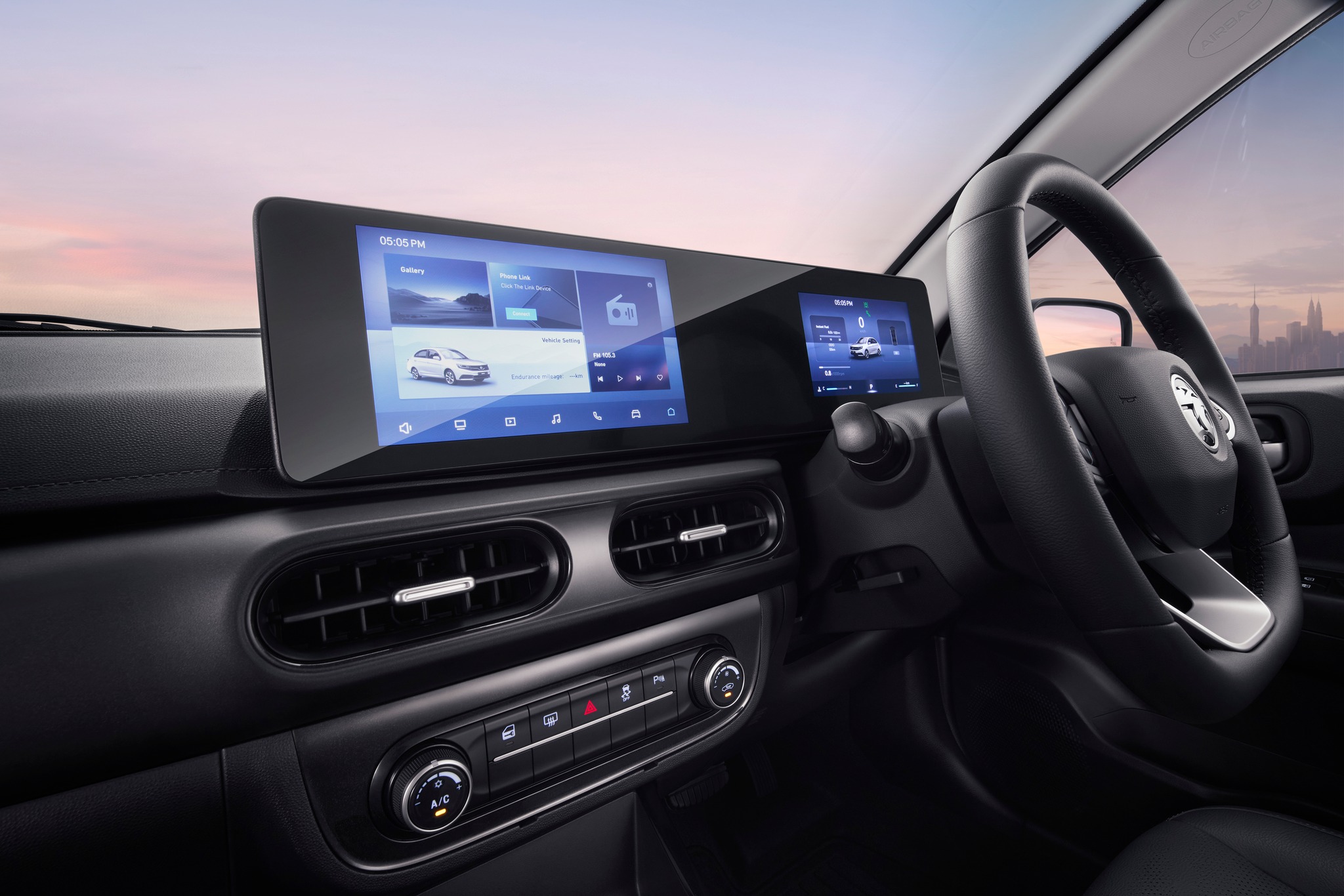 Ruang kabin menerima sentuhan moden dan kontemporari menerusi paparan dwi-skrin bersepadu 16-inci yang menggabungkan kluster instrumen digital 7-inci dan sistem infohibur 9-inci yang menyokong Apple CarPlay serta Android Auto.
