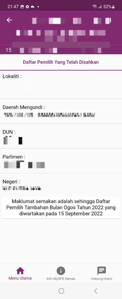 - Selepas anda menekan butang “Semak”, anda akan melihat nama, nombor kad pengenalan, tarikh lahir dan jantina bersama-sama maklumat pemilih. Ini merangkumi lokaliti anda (alamat kediaman yang didaftarkan), daerah mengundi, Dewan Undangan Negeri (DUN) anda, dan jika berkenaan kawasan parlimen anda.
