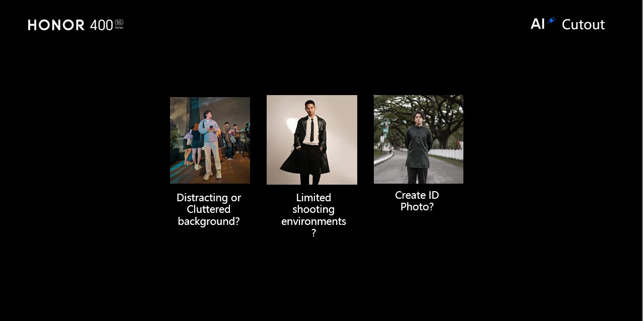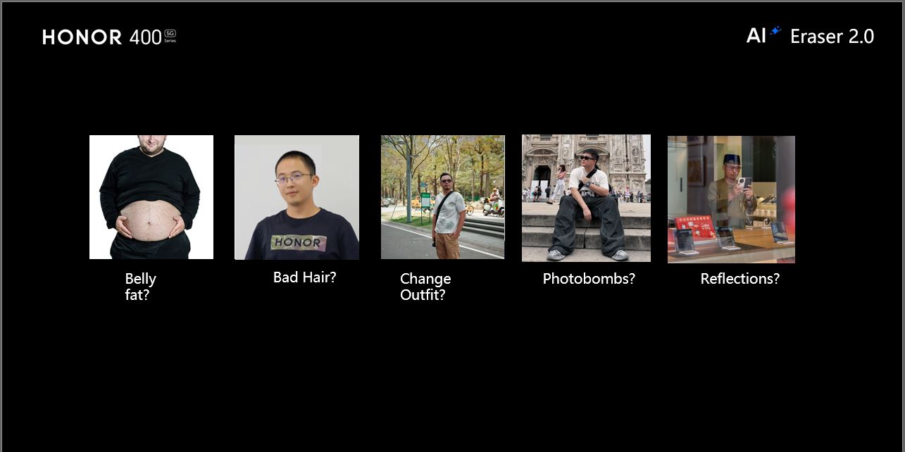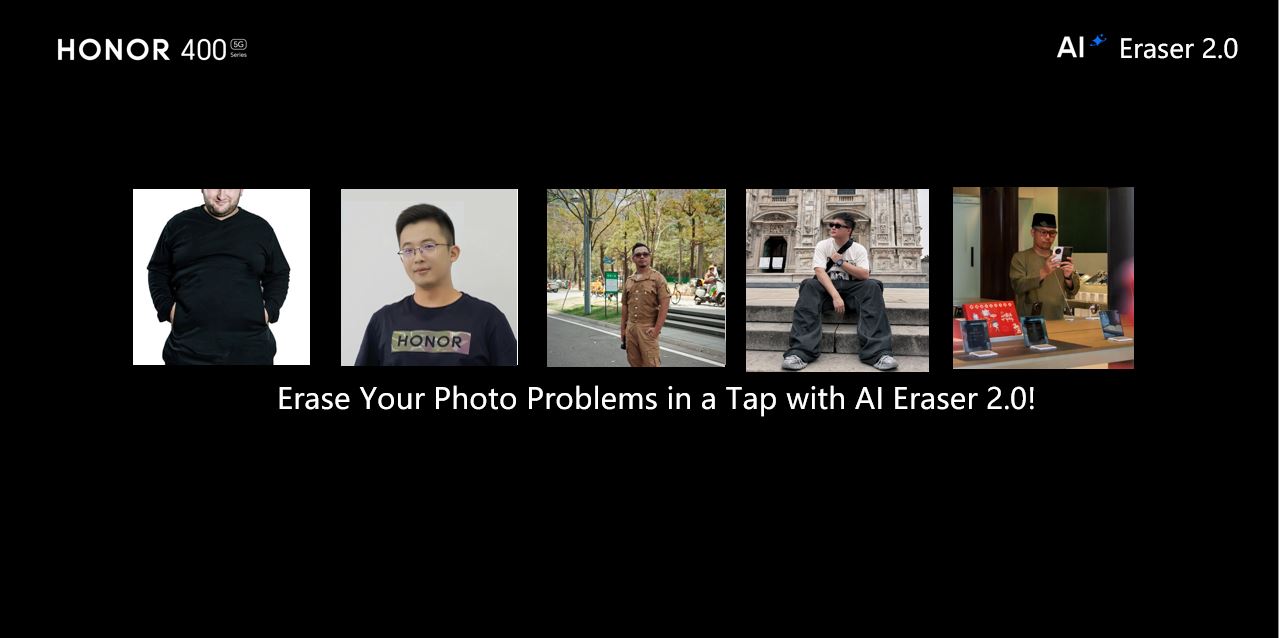 Untuk meningkatkan tarikan kepada gambar, Siri HONOR 400 menawarkan ciri AI Eraser 2.0 yang dipertingkatkan untuk membuang objek tidak diingini atau latar belakang yang berterabur dengan lebih tepat. Ciri AI Erase Passersby menghapus orang yang lalu-lalang, manakala AI Remove Reflection menghilangkan silau dan pantulan pada imej, Ketepatan yang dihasilkan menggunakan ciri-ciri membolehkan gambar tampak lebih profesional dan kemas tanpa aplikasi tambahan.