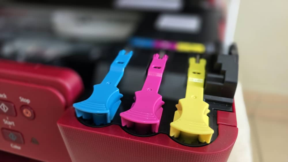Untuk membuat isian semula, anda hanya perlu mengangkat panel penutup ruangan dalamnya di mana tangkinya ditempatkan. Anda boleh kenal dengan keempat-empat tangki berkenaan yang dilabelkan dengan warna masing-masing cyan (biru), magenta (merah jambu), dan yellow (kuning) pada sebelah kanan serta warna hitam (black, bk) pada sebelah kiri.