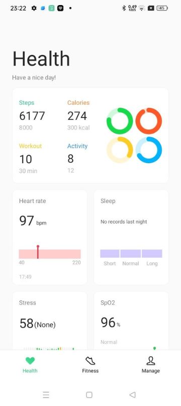 Aplikasi yang dimaksudkan adalah HeyTap Health dari OPPO yang merupakan pendamping digital untuk semua peranti boleh pakai pintar. Paparan utamanya (Health) menyediakan halaman kesihatan yang menyediakan pelbagai jadual parameter kecergasan dalam bentuk teks dan grafik.