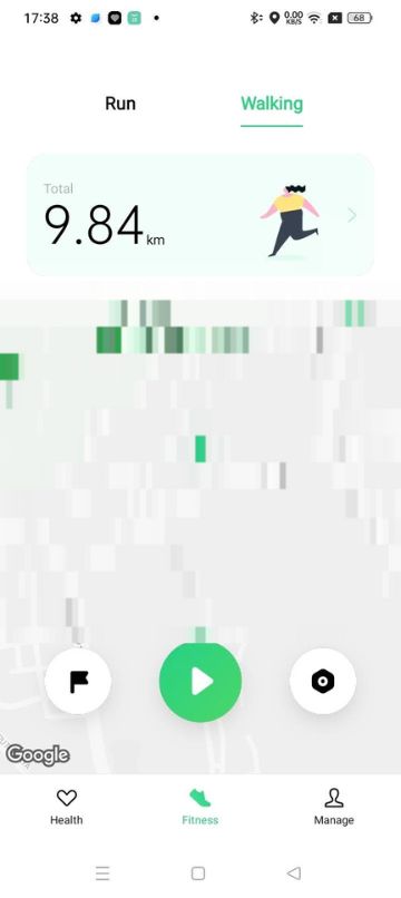 Tab kedua di dalam halaman aplikasi berkenaan pula, Fitness, memaparkan posisi semasa anda melalui Google Map. Anda bileh memulakan sesi Larian atau Jalan Kaki anda dengan mengetik pada butang hijau besar ‘Start’ berkenaan. Usai sesi senaman anda selesai, ketik pada butang berkenaan yang sudah menjadi merah untuk berhenti. Terdapat lebih dari 100 jenis senaman yang anda boleh pilih menerusi OPPO Band 2 bersama-sama aplikasi ini. Keputusan hasil dari senaman bersama-sama laluan yang anda ambil akan dipaparkan pada tab ini.