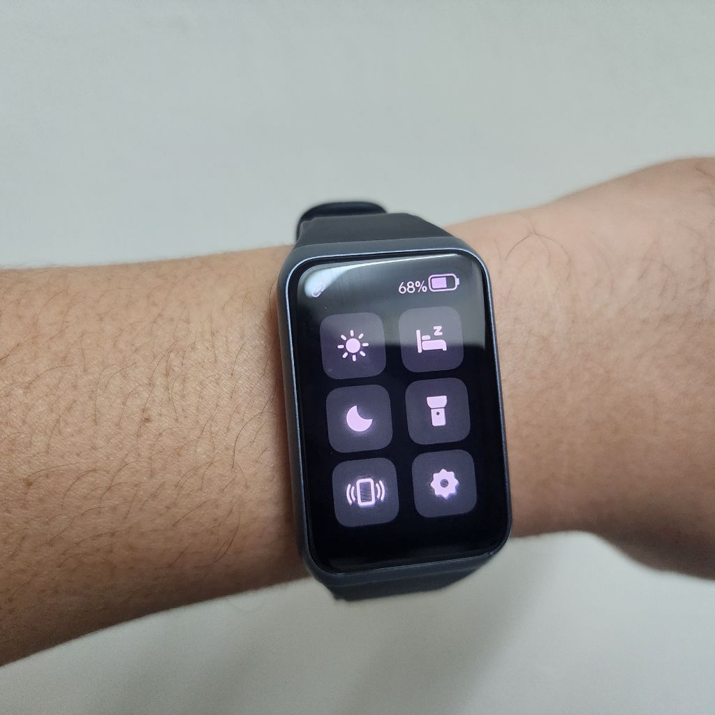 Susunan menunya boleh diakses dengan membuat gerakan gestur ke atas, ke bawah, ke kiri dan ke kanan. Untuk gestur sebelah atas, anda akan mengakses ke panel fungsi segera untuk melaraskan kecerahan, mengaktifkan mod bebas gangguan atau tidur, menghidupkan lampu suluh, mencari telefon anda, dan tetapan tambahan.
