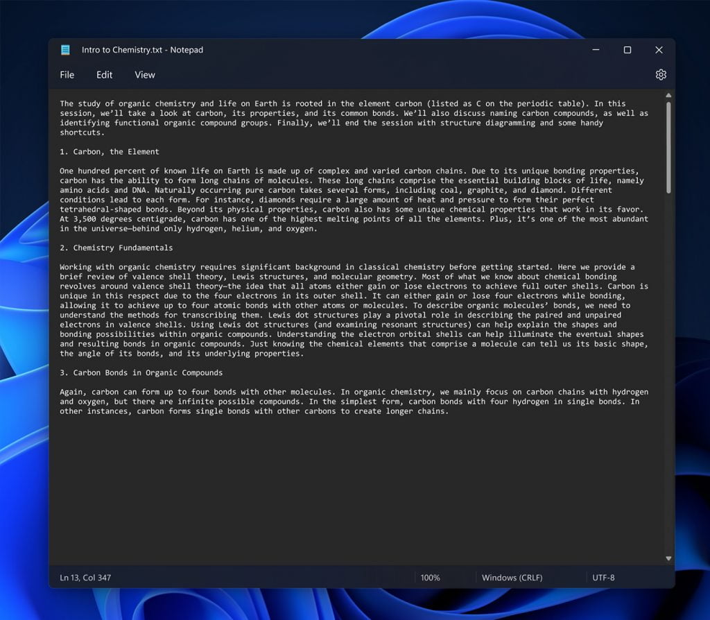 Perubahan terbesar yang dibawakan oleh Notepad for Windows 11 pastinya pada fungsi mod gelap (dark mode). Mod ini ditetapkan secara lalai berdasarkan tetapan tema sistem anda. Anda bagaimanapun masih lagi boleh menetapkannya ke mod terang tanpa perlu mengikuti tetapan tema sistem anda sama ada ia mod gelap mahupun mod terang.