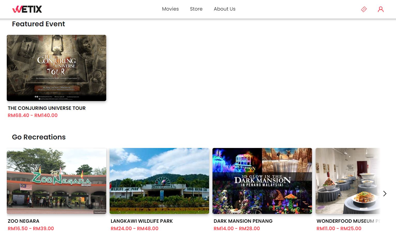 Beberapa aktiviti lain yang tersedia untuk pembelian tiket di WeTix kini termasuk Taman Tema Genting SkyWorlds, Sunway Lagoon, Legoland Malaysia, Sunway Lost World Of Tambun, Zoo Negara, dan tarikan utama lain di seluruh Malaysia yang menjanjikan pengembaraan yang tidak dapat dilupakan.